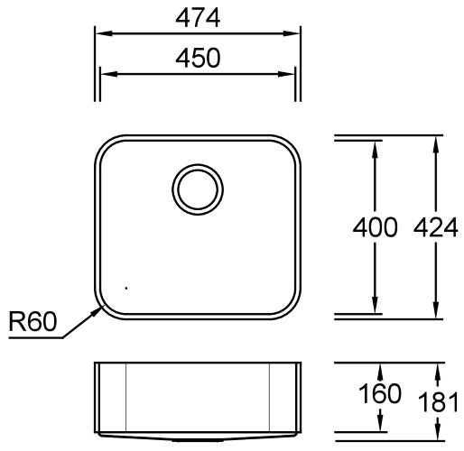 Unterbauspülbecken aus Mineralwerktoff Staron 12 mm inkl. Ab- und Überlaufgarnitur excenterbetätigt